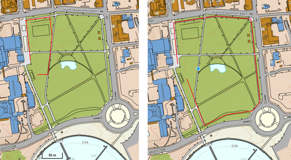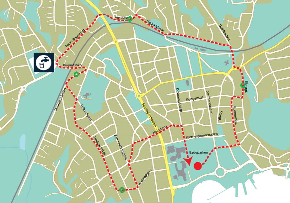 Det er drikkestasjon i badeparken, dvs ved målgang for 5 km, og halvveis i løpet for 10 km. Hver km er markert med grønn sirkel.